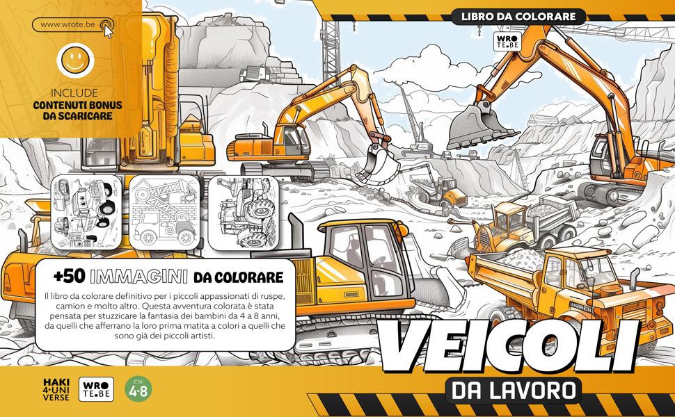 Dai vita a questi imponenti veicoli. Acquista ora e inizia il tuo viaggio creativo con il nostro libro da colorare! Pieno di divertimento, educazione e creatività, è il regalo perfetto per ogni giovane artista desideroso di esplorare il mondo dei grandi mezzi da lavoro.